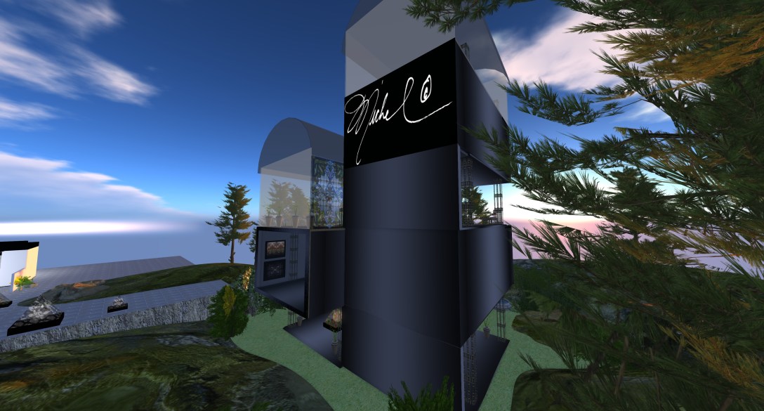 This gallery exhibits both past and present work by Maya Eight and Aztec Fenstalker. This is the largest gallery and features both real life art work as well as sculptures. There is a teleporter to the beach house far below on the mainland where you can wander around a lovely forest garden or sit and watch the waves hit the shore.
